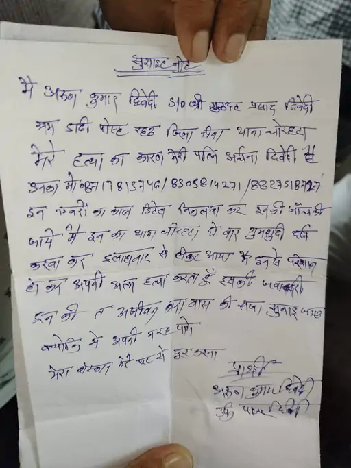 मरने से पहले अरुण द्विवेदी ने एक बयान दिया और एक सुसाइड नोट भी लिखा। सुसाइड नोट में उसने अपनी मौत के लिए पत्नी अर्चना द्विवेदी को जिम्मेदार ठहराया है। युवक ने लिखा है, “मेरी हत्या का कारण मेरी पत्नी अर्चना द्विवेदी है, इसे आजीवन कारावास की सजा दी जाए।” मृतक ने सुसाइड नोट में यह भी लिखा कि वह प्रयागराज से घर लौटा है और खुदकुशी कर रहा है।