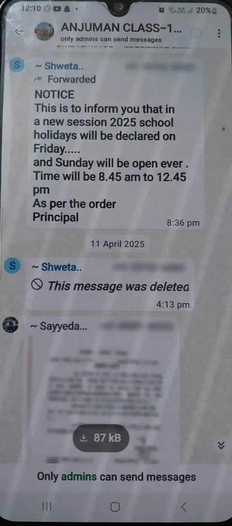 मैसेज बच्चों के पेरेंट्स के मोबाइल पर भेजा गया। मैनेजमेंट का कहना है कि जुमे की नमाज के कारण बच्चे स्कूल नहीं आते हैं, इसलिए शुक्रवार को छुट्टी रखने का निर्णय लिया गया।