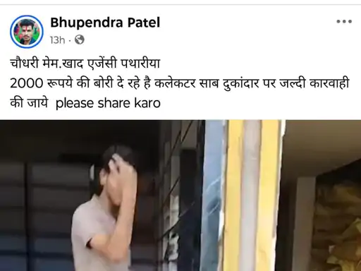 दमोह जिले के पथरिया नगर में खाद की कालाबाजारी का एक वीडियो सामने आया है। इस वीडियो में डीएपी खाद की एक बोरी, जिसका सरकारी मूल्य 1348 रुपए है, 2000 रुपए में बेची जा रही है। केवलारी गांव के किसान भूपेंद्र पटेल ने यह वीडियो वायरल कर चौधरी खाद एजेंसी पर आरोप लगाया है।